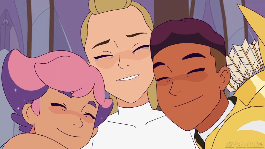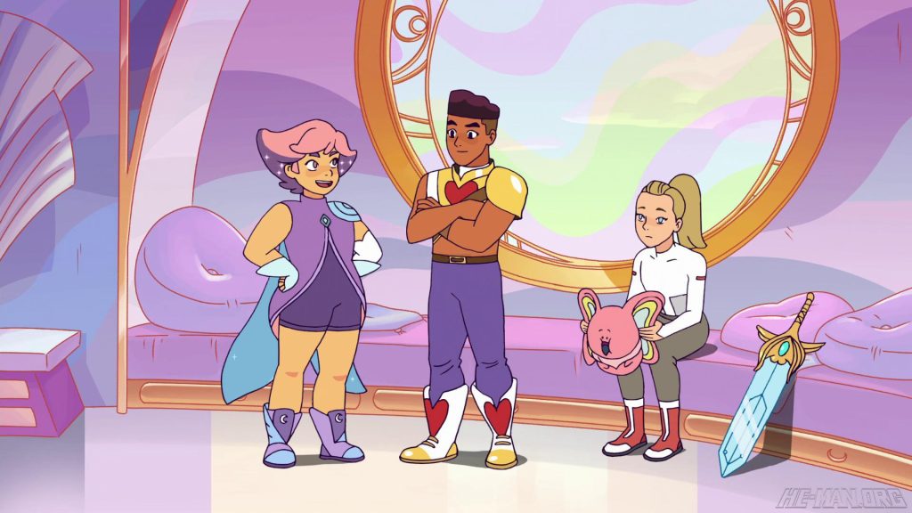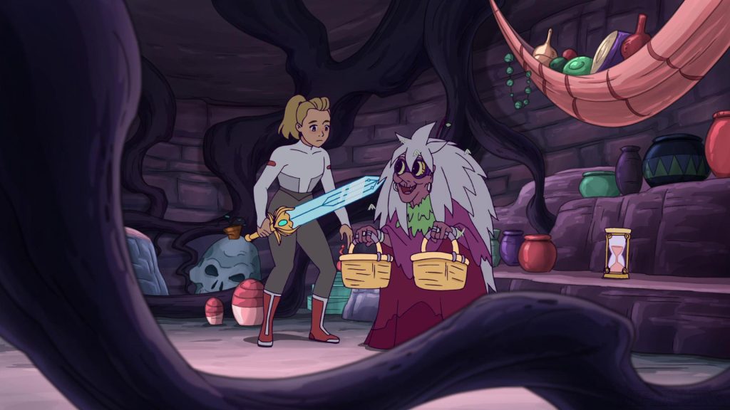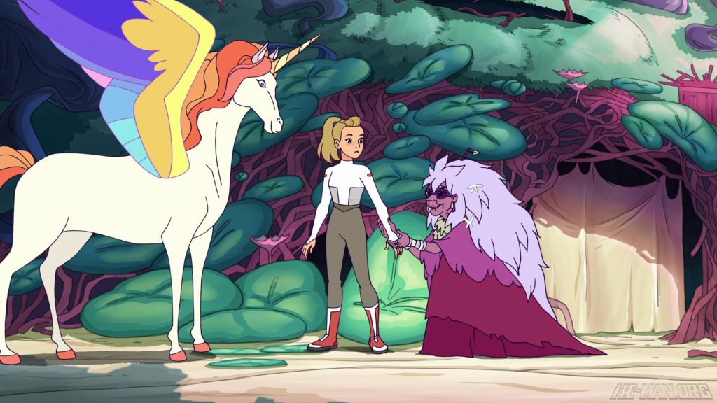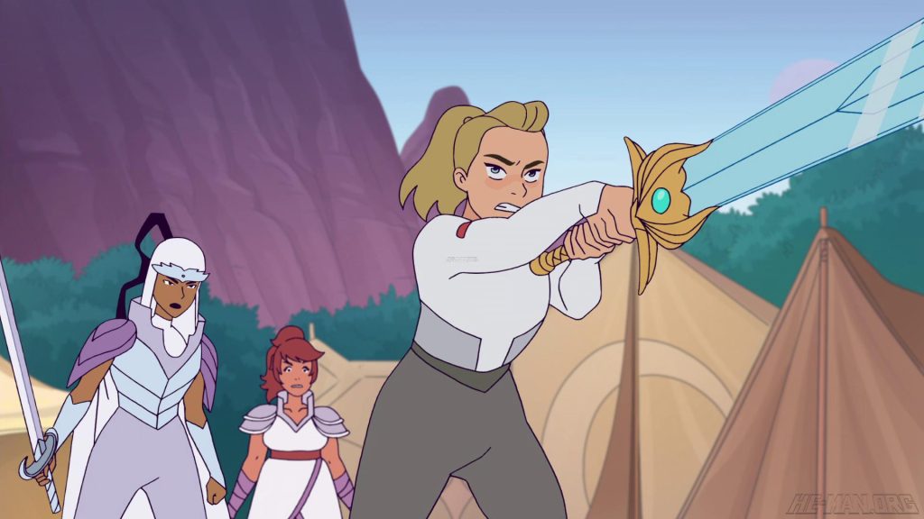 After Adora and Razz observe more ruins and past devastation caused by the Horde, the ancient woman reflects tells Adora it is okay to be afraid and that she needs to act on her own beliefs and thoughts if she is to confront her problems. With newfound confidence, and seeing Swiftwind captures by more Horde soldiers, Adora successfully transforms into She-Ra. She-Ra successfully defeats the evil forces but is knocked out in the process. Razz and Swiftwind successfully bring Adora back to safety just as Horde reinforcements arrive, and the new ancient mentor fully supports her new friend’s decision to head back to the rebellion to fight. Riding back on Swiftwind, She-Ra walks in on Angella scolding Glimmer for letting a Horde prisoner into Bright Moon. She-Ra tells Angella the truth that she, Adora, is a defected Horde Soldier, and despite the background of the just-arrived hero, Angella accepts her into the rebellion.