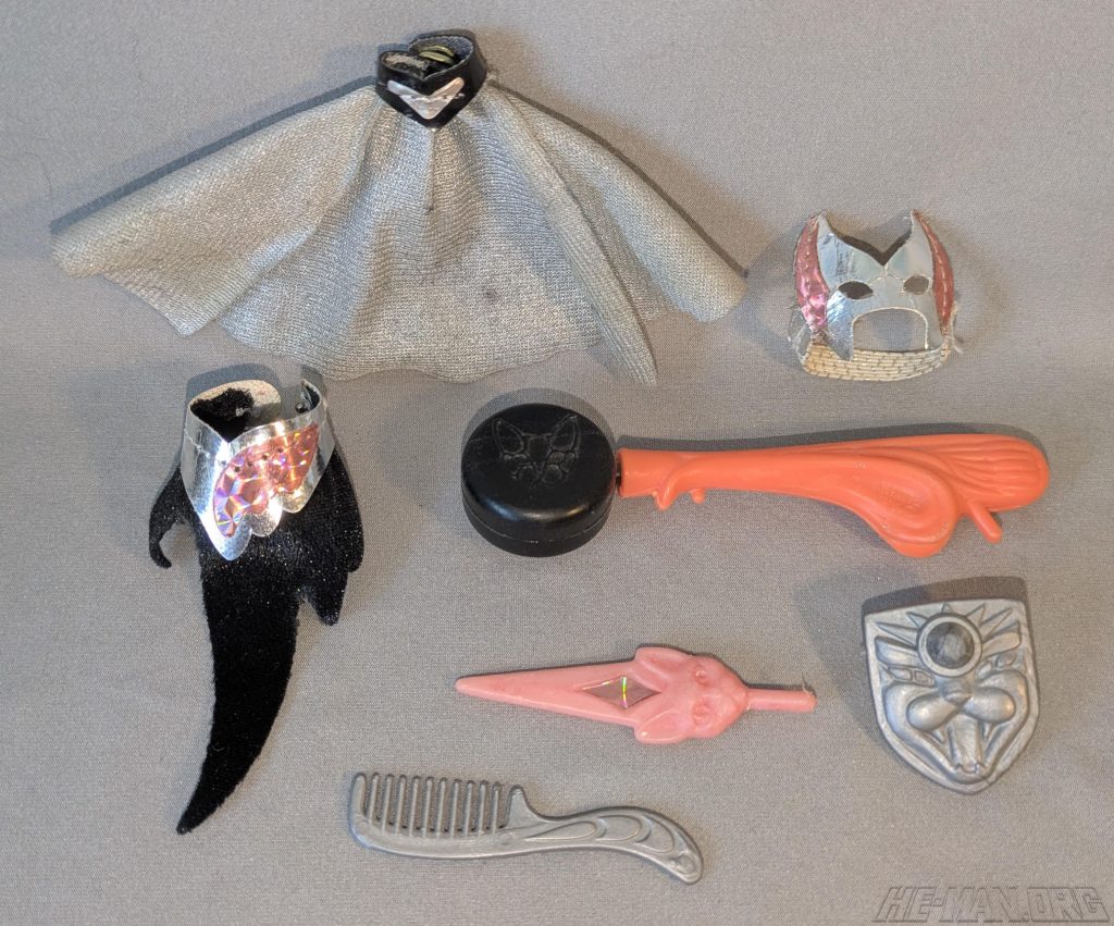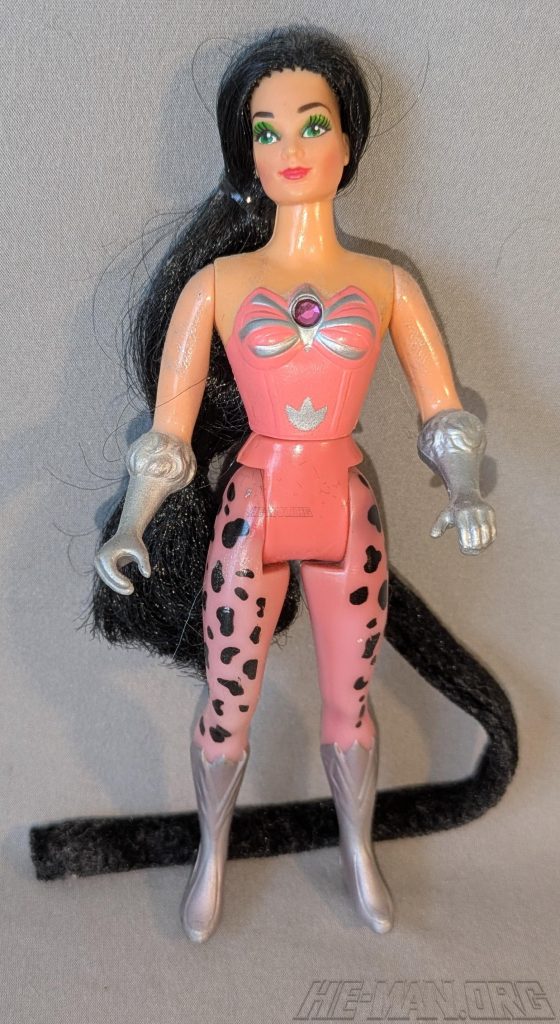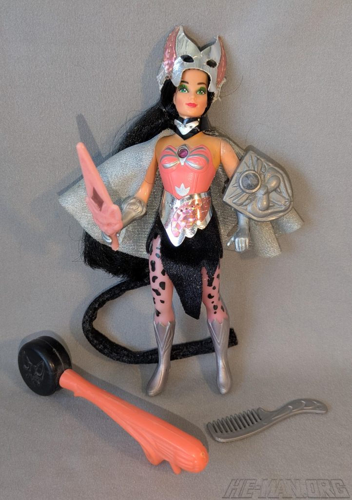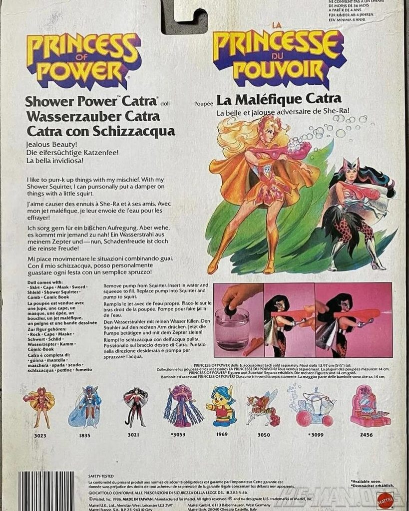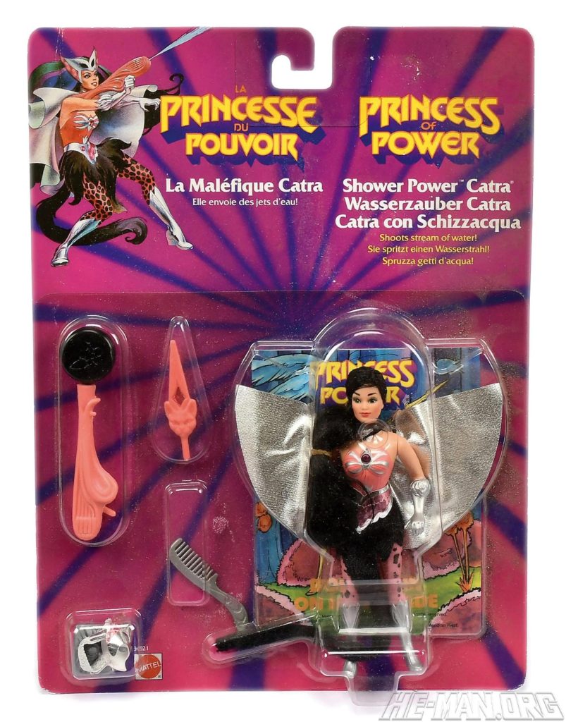 Shower Power Catra was the jealous beauty in the Princess of Power line. She came with a shower squirter and pump, a cloth cape, a cloth shirt, a cloth mask, a sword, a comb, and a shield. Her squirter accessory allowed her to squirt water at her enemies!