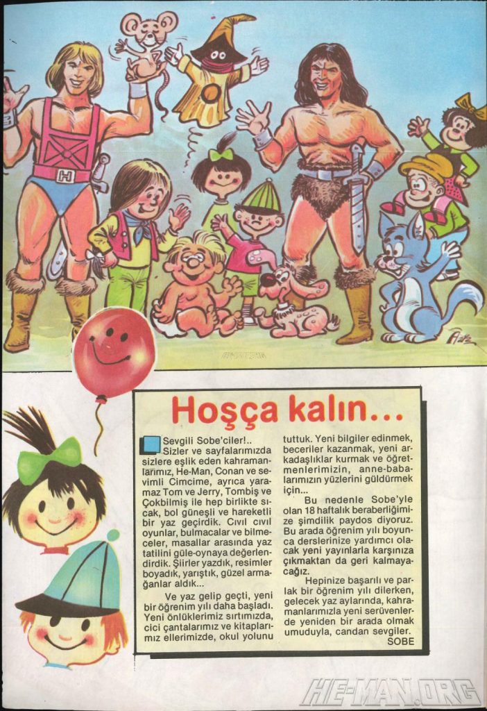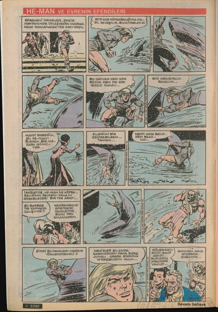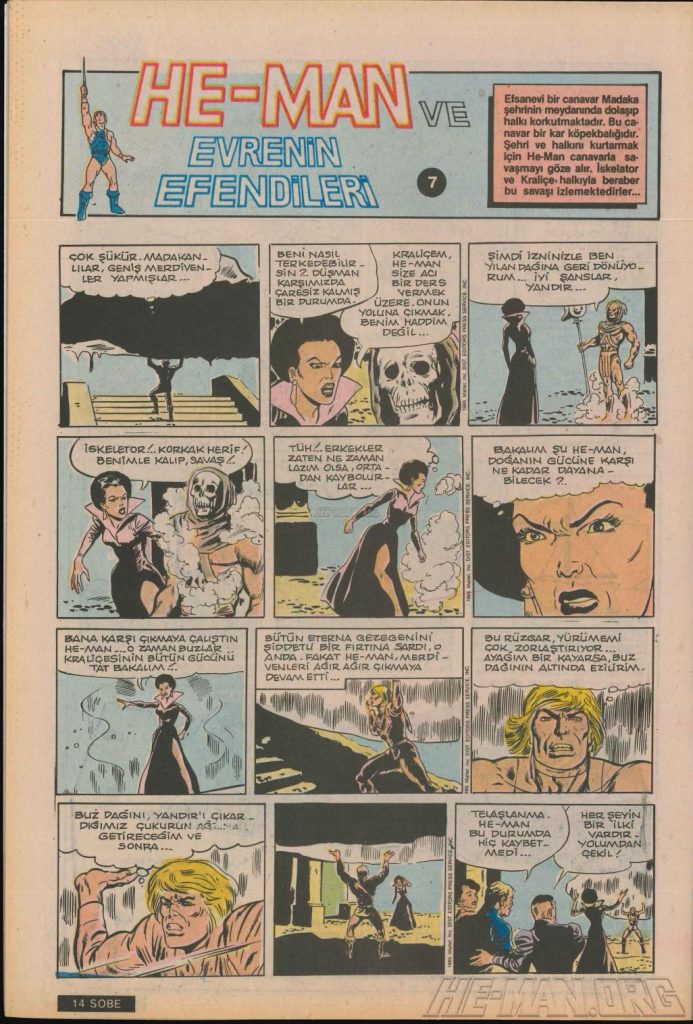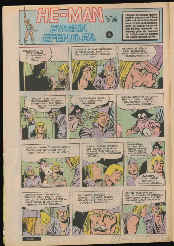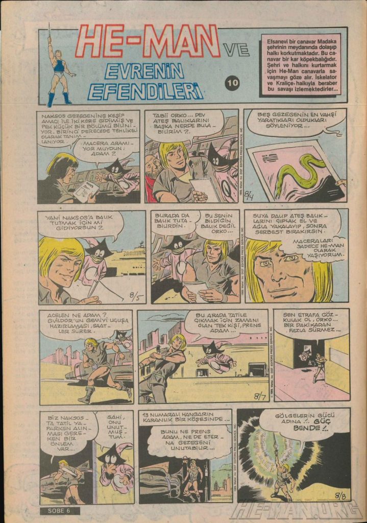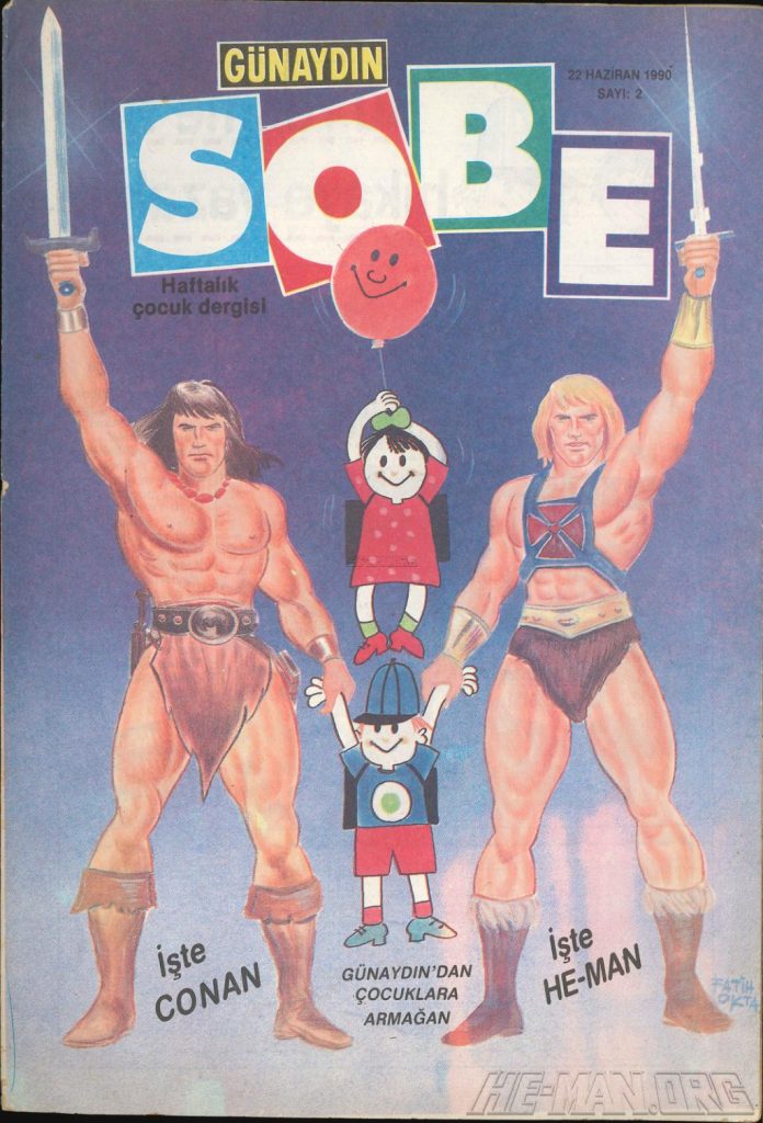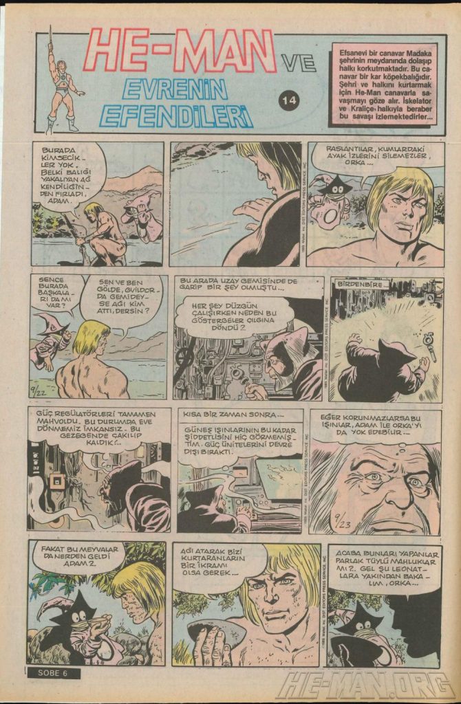 Here is the complete collection of the Turkish Sobe Gunaydin series. Each magazine featured a short MOTU comic in Turkish. We’ve included only the pages relevant to Masters of the Universe. These were translated from the original US newspaper comics illustrated by Gerald Forton. There were only 18 issues and only the first 17 issues have a He-Man comics page. Most issues have 2 pages dedicated to Motu but a few only had one page. Other stories in this series included Conan the Barbarian, Tom and Jerry, CIme CIme (a pirate comic), and occasionally a few short panels of other various subjects. Scanned by Ben Massa.