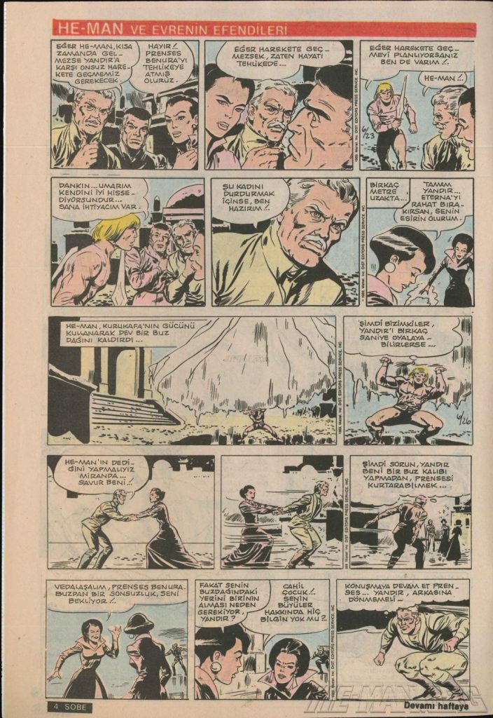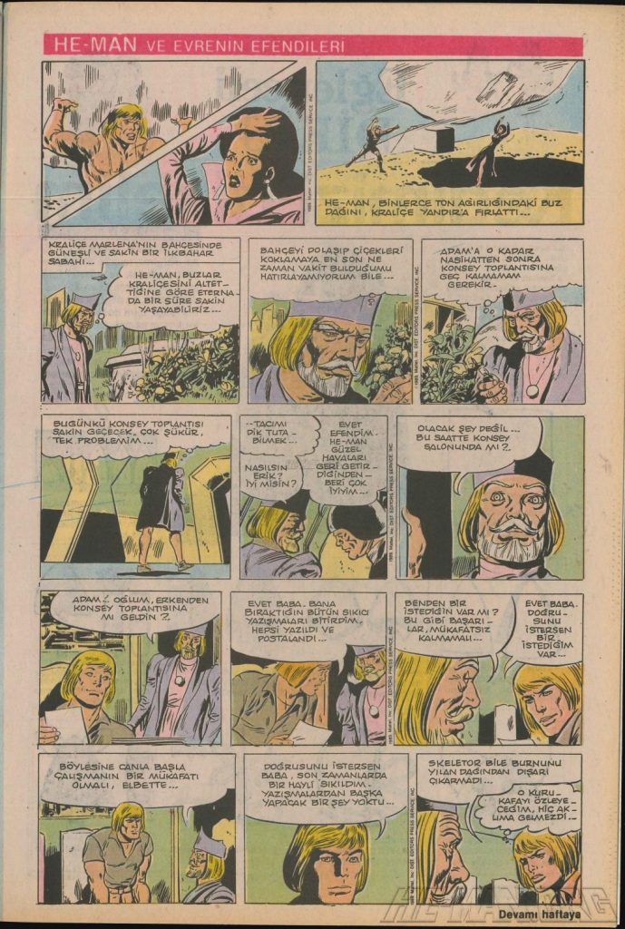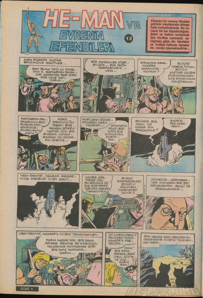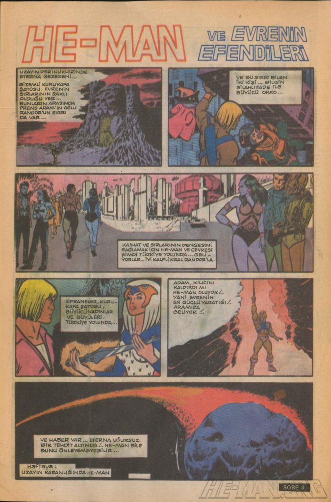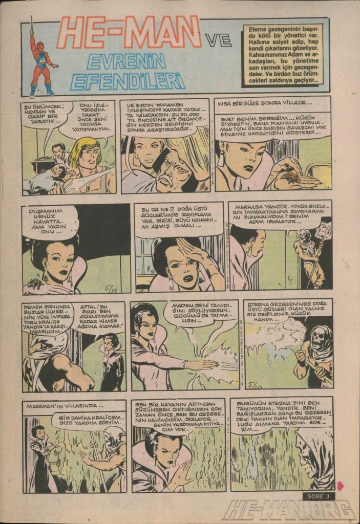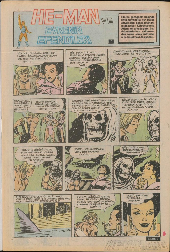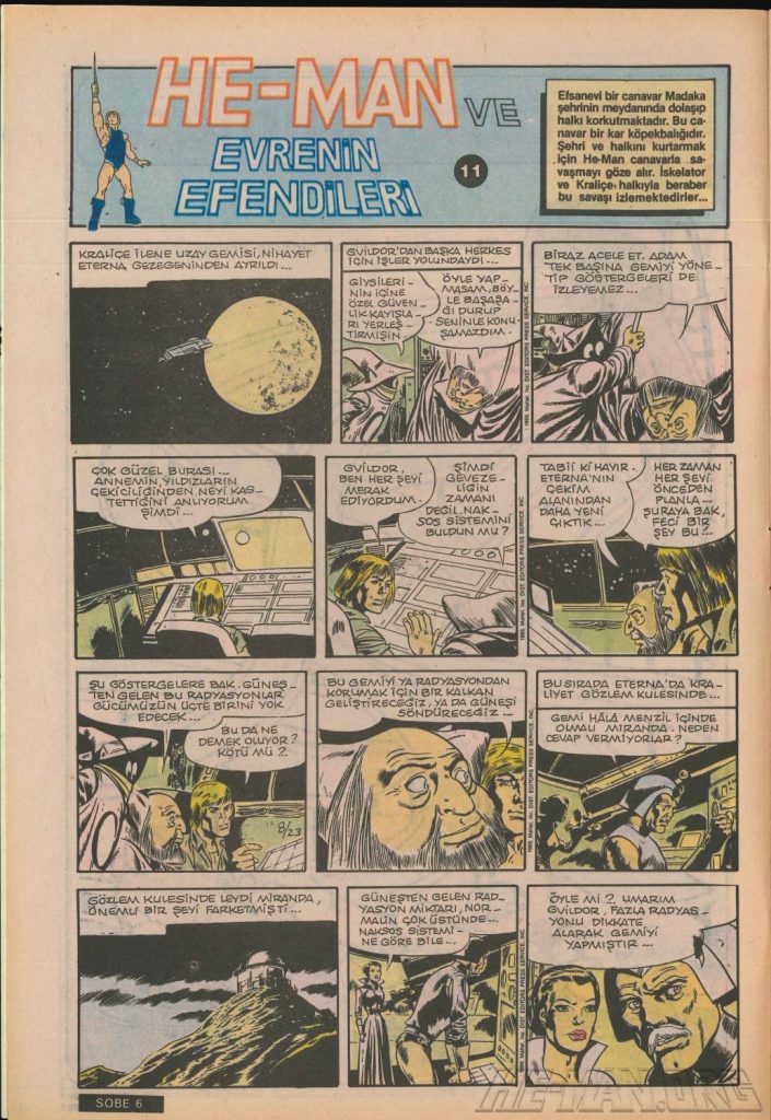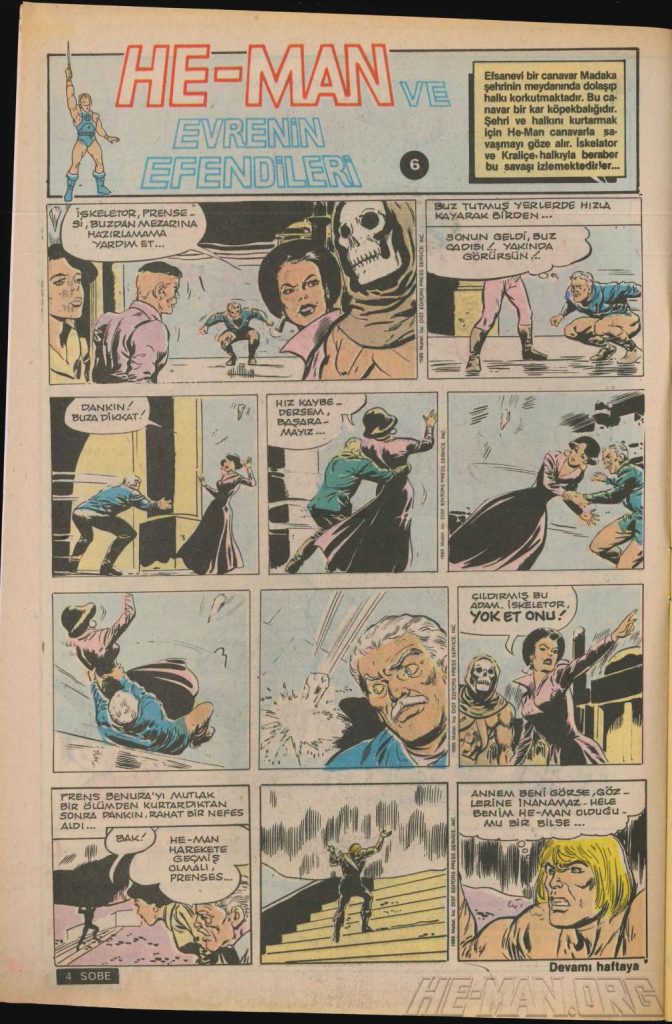 Here is the complete collection of the Turkish Sobe Gunaydin series. Each magazine featured a short MOTU comic in Turkish. We’ve included only the pages relevant to Masters of the Universe. These were translated from the original US newspaper comics illustrated by Gerald Forton. There were only 18 issues and only the first 17 issues have a He-Man comics page. Most issues have 2 pages dedicated to Motu but a few only had one page. Other stories in this series included Conan the Barbarian, Tom and Jerry, CIme CIme (a pirate comic), and occasionally a few short panels of other various subjects. Scanned by Ben Massa.
