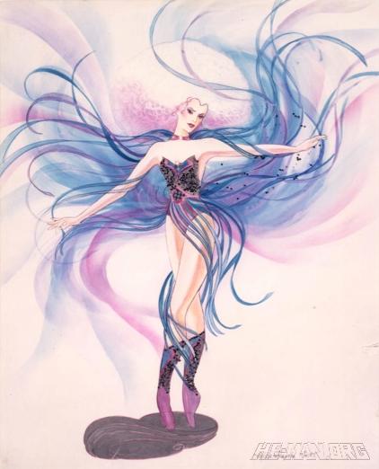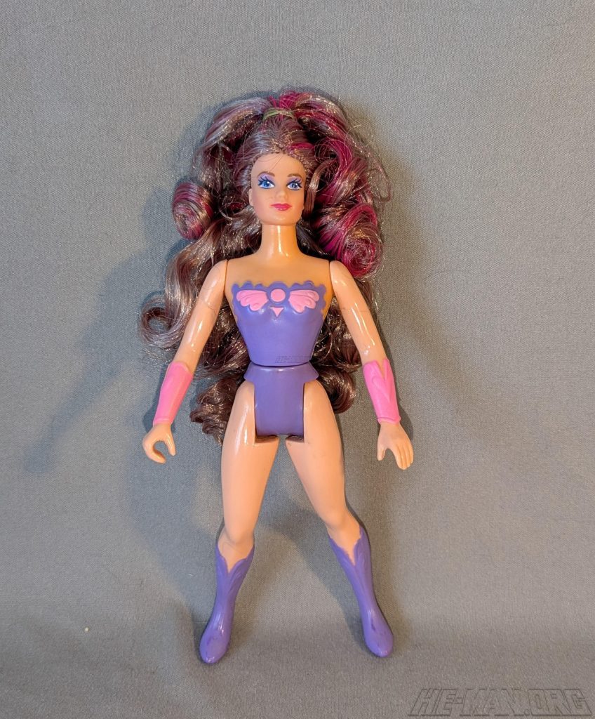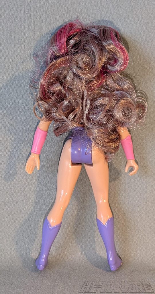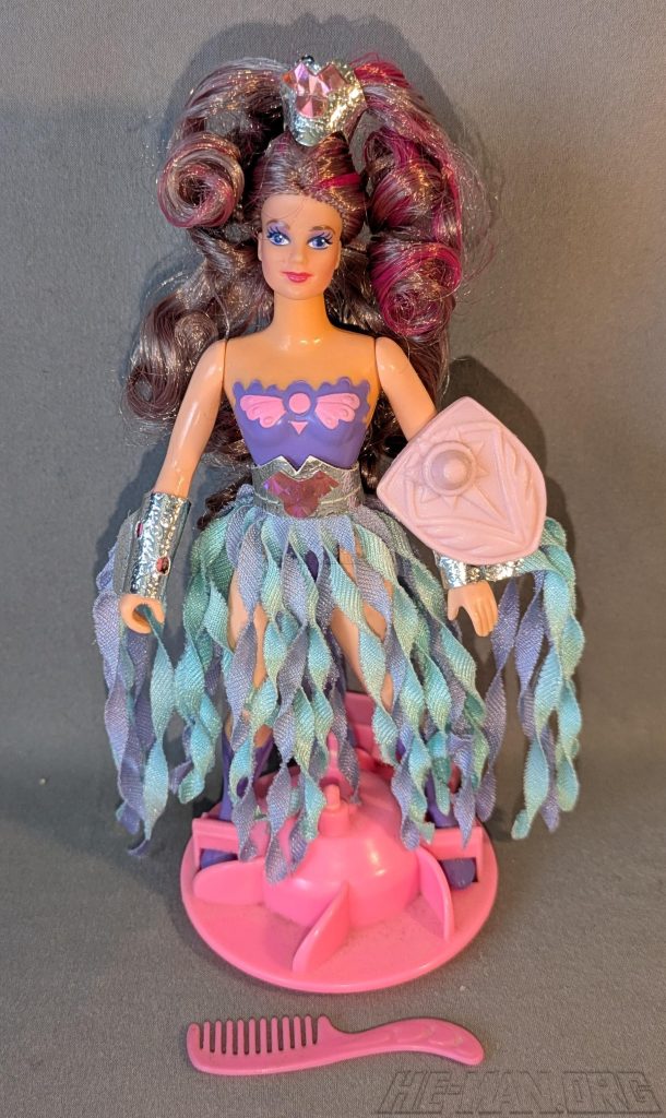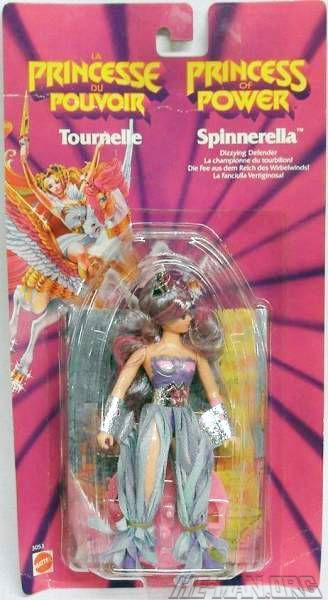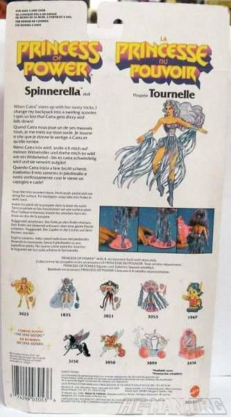 Spinnerella was the dizzying defender in the Princess of Power line. She came with fringed cloth skirt, two fringed cloth forearm bands, a scooter/backpack, a cloth hair band, a shield, and a comb. Her backpack could be ridden like a scooter. When pushed forward it would spin rapidly, causing the figure to spin. It was almost like a miniature Roton from the MOTU line! Centrifugal force would cause the fringes on her costume to move outward.