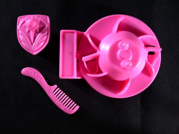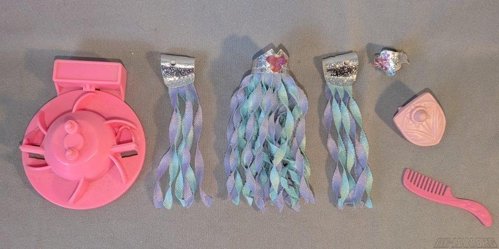 Please note that the above figure has Starburst She-Ra’s shield. The actual Spinnerella shield is the same pink as the other accessories, as shown below: