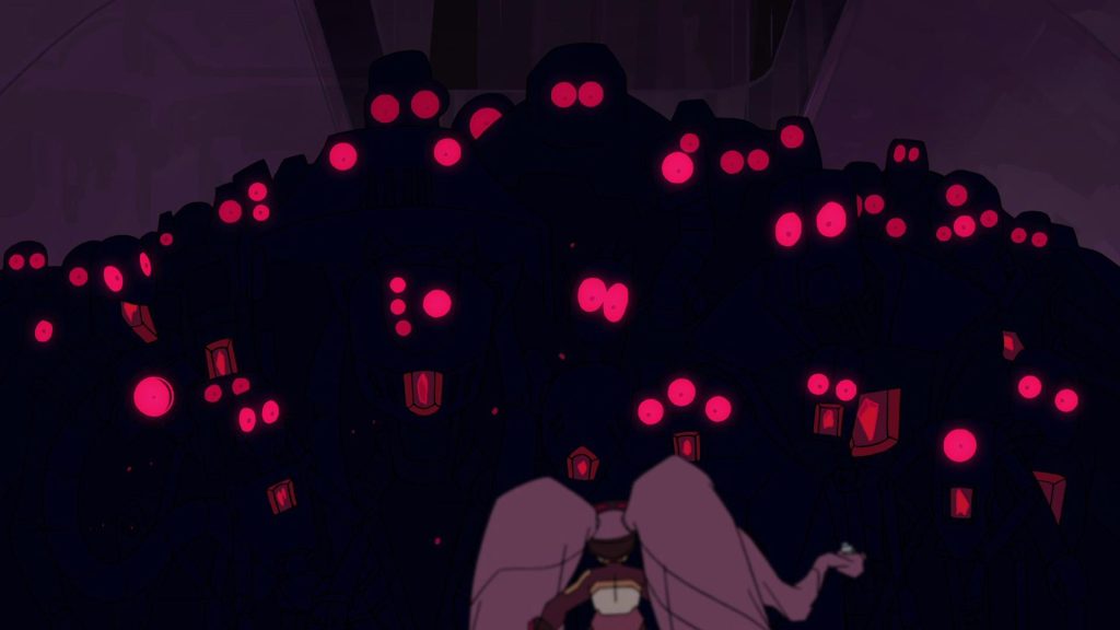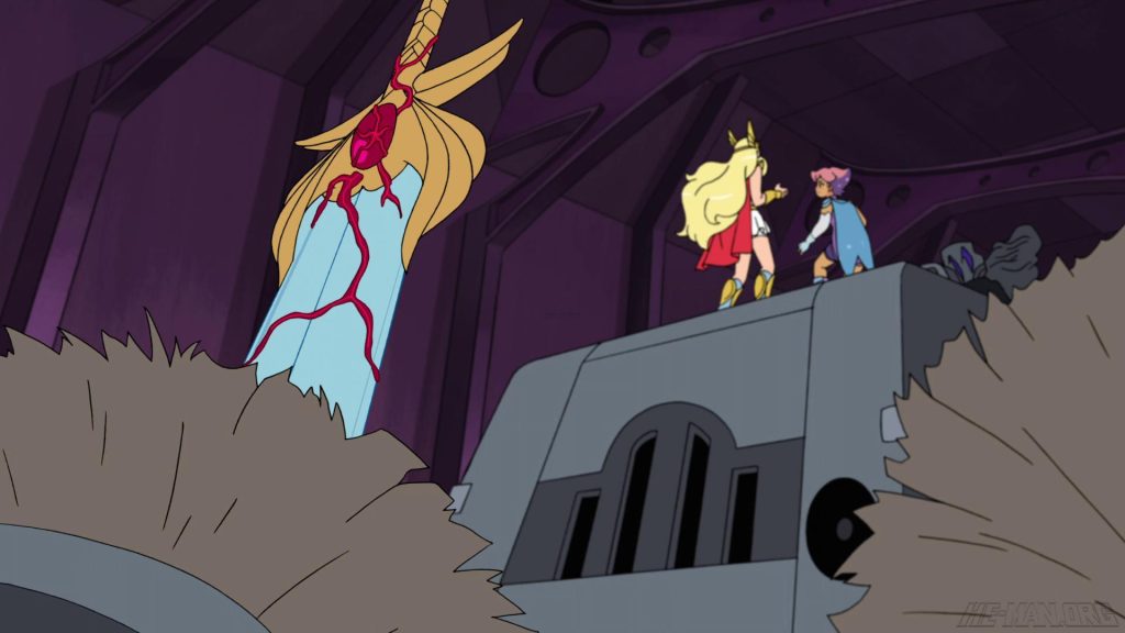 Adora, Glimmer, and Entrapta retreat from, and then face off against a giant cleaning robot, and in the process She-Ra’s sword is corrupted by the same virus spreading across to the robots, causing She-Ra to become a mindlessly aggressive brute. Glimmer forcefully takes the sword away from She-Ra, who then powers down and is seemingly intoxicated from the First One’s tech virus. Adora, Glimmer, and Entrapta soon set off to navigate the maze to head back to the main lab to shut off the power source allowing the virus to spread.