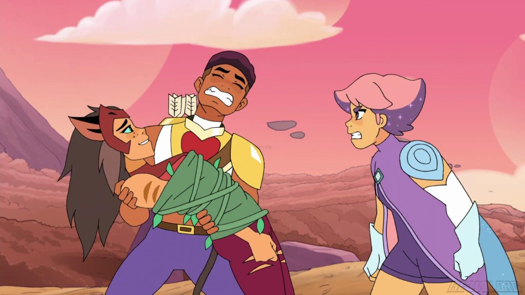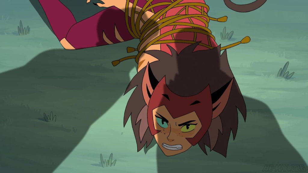 As Glimmer and Bow take Catra back to Bright Moon, Catra does her best to give them the most difficult time imaginable filled with taunts, deliberate sabotaging of routes, and other multiple annoyances, much to her captors detriment. Eventually, one argument results in an intense exchange where Glimmer states Adora left Catra for these very reasons while Catra mocks Glimmer for believing Adora will remain her friend in the future. Eventually, Scorpia finds the three of them thanks to a force captain badge containing a tracking beacon Catra had. After an exchange between both sides where Catra threatens to have Entrapta killed if they don’t release her, Catra then reveals to Glimmer and Bow the truth that the technological princess has willingly sided with the Horde. Entrapta, still on video-call on the trackpad verifies this to her former friend’s faces.