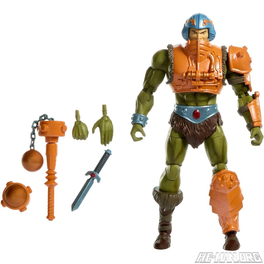 Man-At-Arms was released in the Masterverse Vintage Collection line in 2025. He is closely based on the vintage toy, albeit with nods to the original Mark Taylor design for the character, including the ball and chain mace and the fur around his armor. He came with a two extra hands, removable armor, two mace options, and a knife.