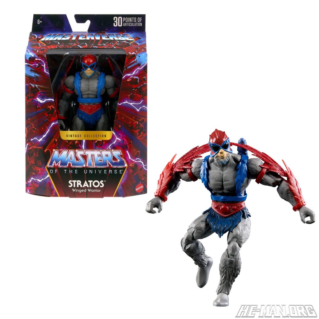 Stratos was released in the Masterverse Vintage Collection line in 2025. He was closely based on the vintage toy. He came with removable armor and no extra accessories.